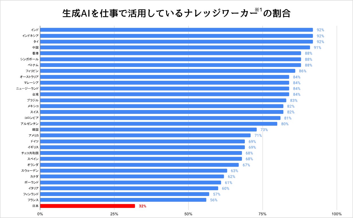 近年、AI技術の進展に伴い、業務への導入が各国で進んでいます。しかし、海外と比較すると日本におけるAI導入率は低い状況です。MicrosoftとLinkedInが2024年5月に公開したデータによれば、職場でのAI利用率は世界全体で75%であるのに対し、日本では32%に留まっています。