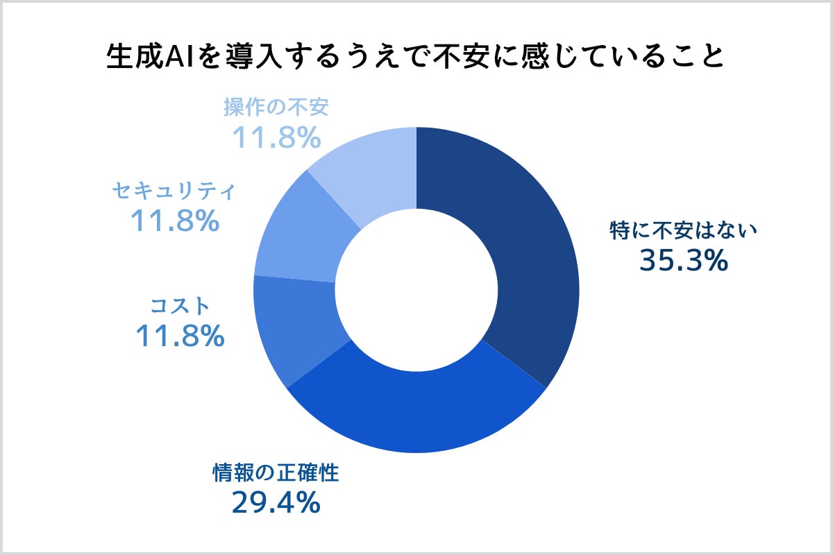 また、操作性や活用面での不安も11.8%見られました。「効率の良い使用方法がわからない」「使いこなせるか不安」などの意見が挙げられています。生成AIを導入しても十分に活用できず、かえってコストや時間を無駄にするのではないかと感じる企業が一定数いるようです。