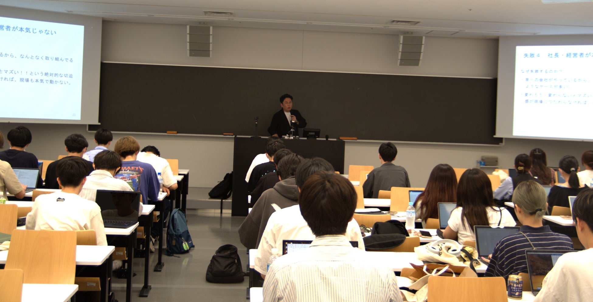 講義では、DXの定義・本来をはじめ、具体的な調査結果のデータを使うことで、日本におけるDXの全体像を分かりやすく伝えました。DXの成功率が低い現状においては、事例を通じて「現場の話を聞きすぎる」、「ベンダー丸投げ」、「リーダー不在」、「社長・経営者が本気じゃない」という4つの大きな失敗原因を指摘しながら、弊社の顧客であるビジネストラベル専門会社などのDX成功ケーススタディを分析することで企業におけるDXの重要性と成功へのアプローチを解説しました。
