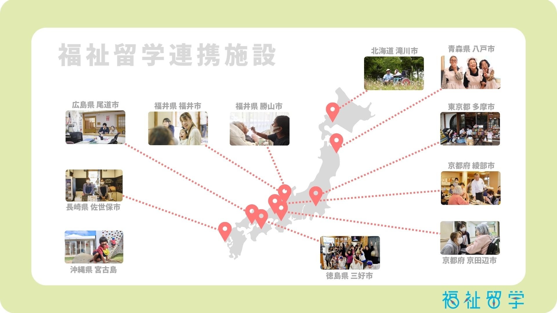 青森県、東京都、福井県、京都府、広島県、徳島県、長崎県、沖縄県の福祉施設で留学を実施