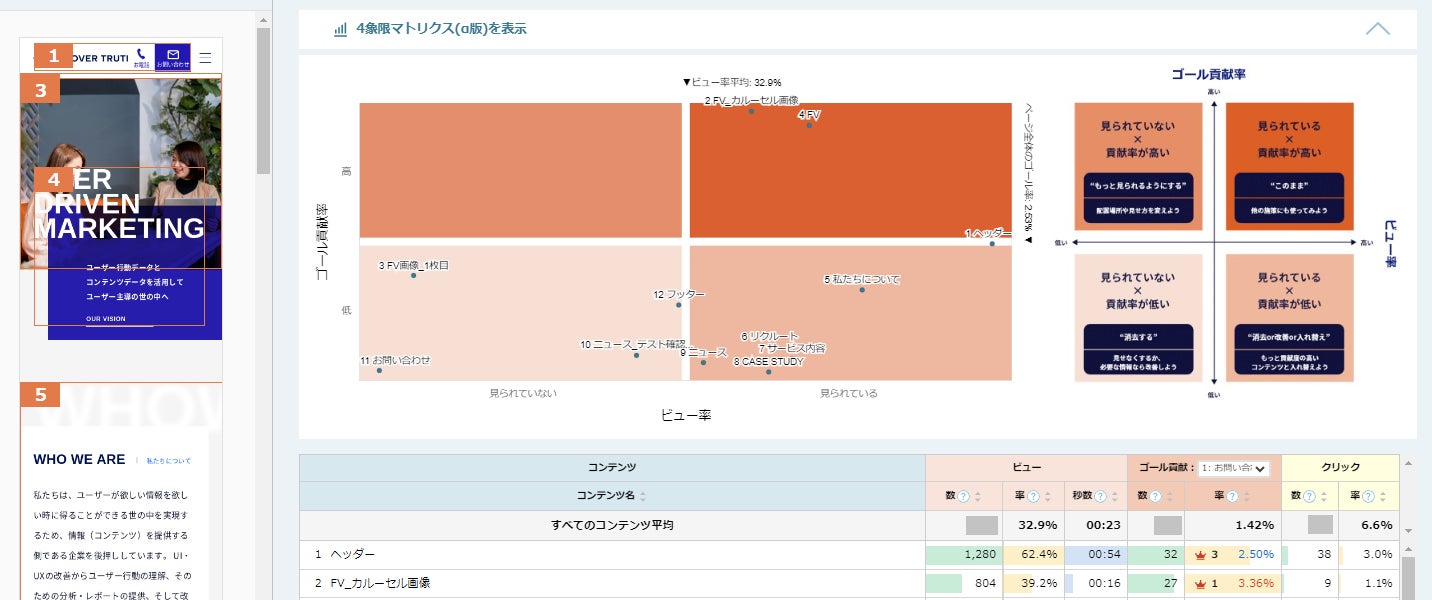 Webページ内の画像やテキスト(以下:コンテンツ)毎の成果を数値化するツール『Content Analytics(以下:コンテンツアナリティクス)』を提供する株式会社UNCOVER TRUTH(本社:東京都新宿区、代表取締役:石川敬三)は、各コンテンツの成果を4象限に自動でマッピングする「4象限マトリクス機能」をリリースしました。
