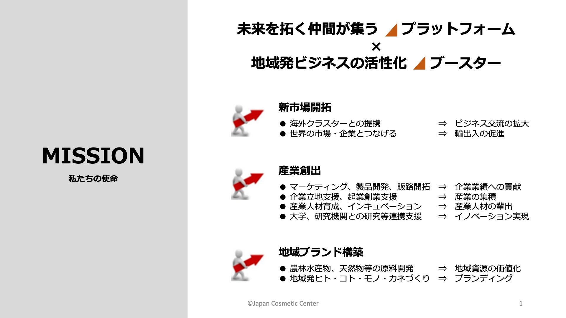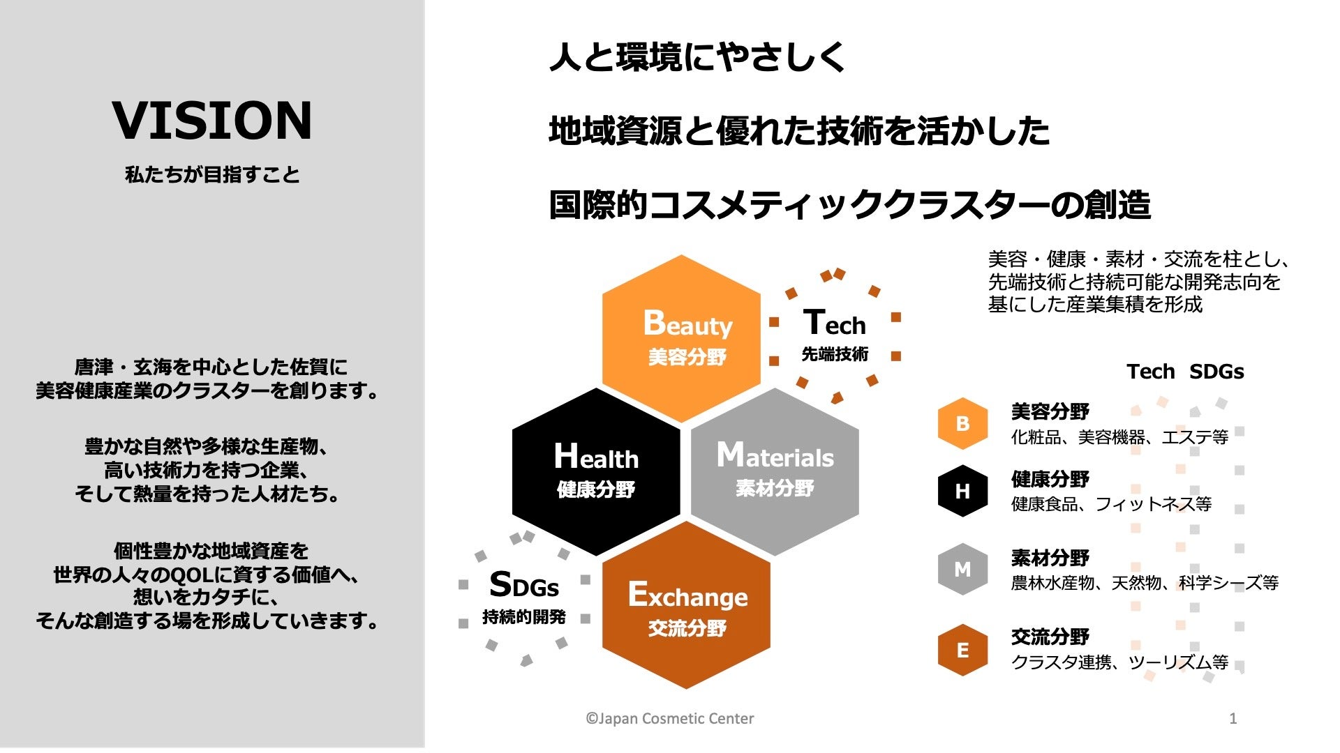 一般社団法人ジャパン・コスメティックセンターは、コスメティック分野のビジネス環境を産学官の連携により整備し、多様な人材の交流と技術の集積による地域資源を活かした経済活動の活性化と、グローバル市場への展開を図る推進体制を構築することにより、唐津市、玄海町を中心とした佐賀県、ひいては北部九州におけるコスメティック産業の集積と雇用の創出に寄与することを目的とした団体です。