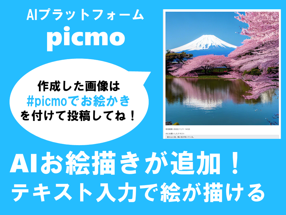 2022年11月4日(金)よりAIプラットフォーム「picmo(ピクモ)」にAI画像生成サービス「AIお絵描き」が追加しました。