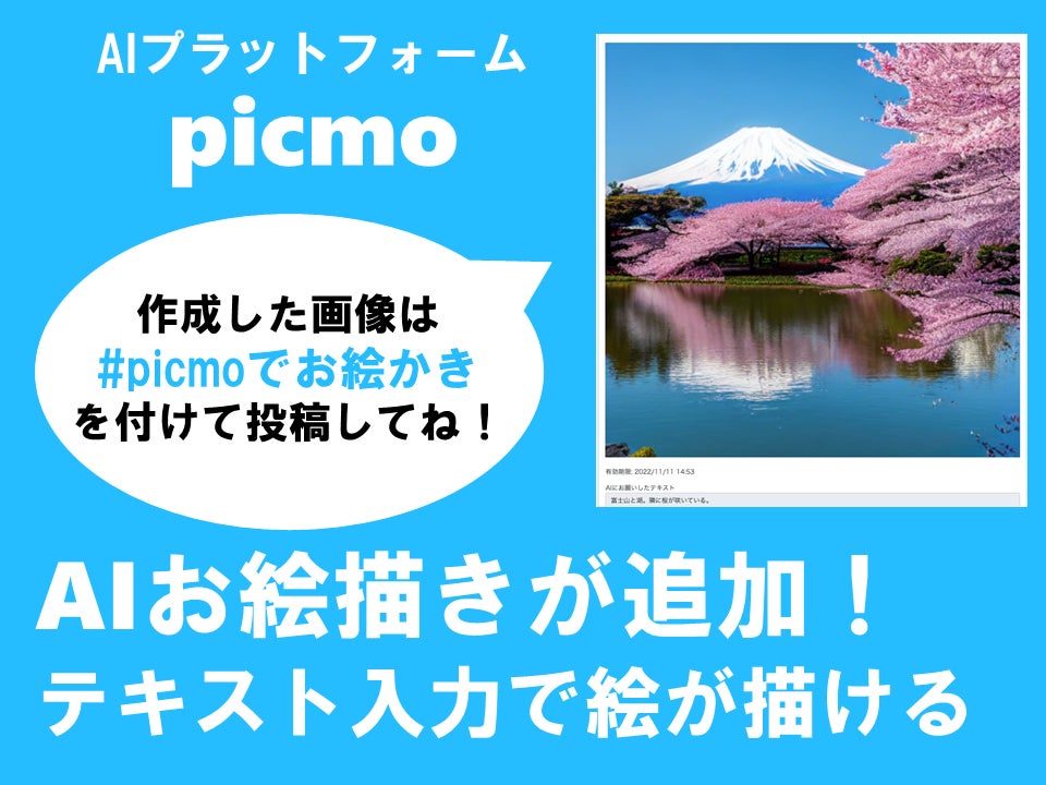 2022年11月4日(金)よりAIプラットフォーム「picmo(ピクモ)」にAI画像生成サービス「AIお絵描き」の新機能が追加されたことをお知らせいたします。