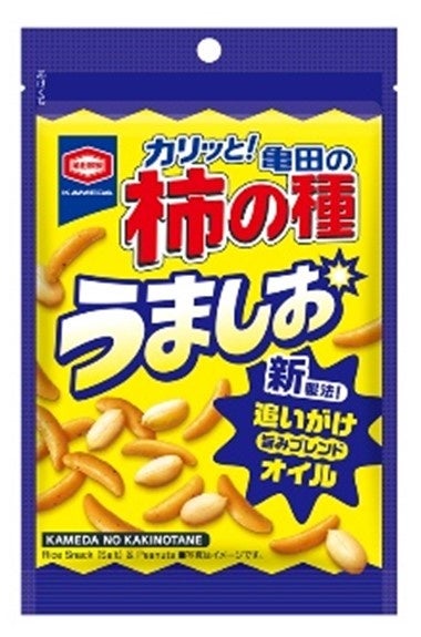 『亀田の柿の種 うましお』は、「亀田の柿の種」ならではのカリッと食感はそのままに、ぽいぽい食べ続けられる、これまでとはひと味ちがう“しお味”の「亀田の柿の種」です。新製法“オイルがけ”を用い、従来品では表現しきれなかった旨みたっぷりな味わいを実現しました。ガーリックやネギをきかせた特製旨みブレンドオイルを追いがけすることで、唐辛子のピリッとした辛味は控えめにしながらも、満足感のある旨味たっぷりな味に仕上げました。家族みんなのシン・ど定番として様々なシーンでお楽しみください。