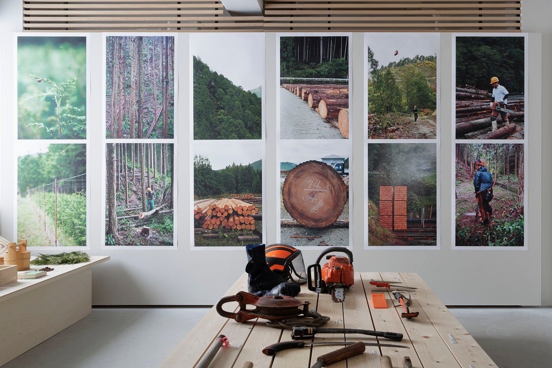 MASのデザイナーでもあるVille Kokkonen(ヴィッレ・コッコネン)によるヒノキのリサーチ展示では、日本各地の主要なヒノキの産地を視察した記録を、伐採現場の写真や映像を交えて紹介。ヒノキを取り巻く現状をリアルに伝えます。