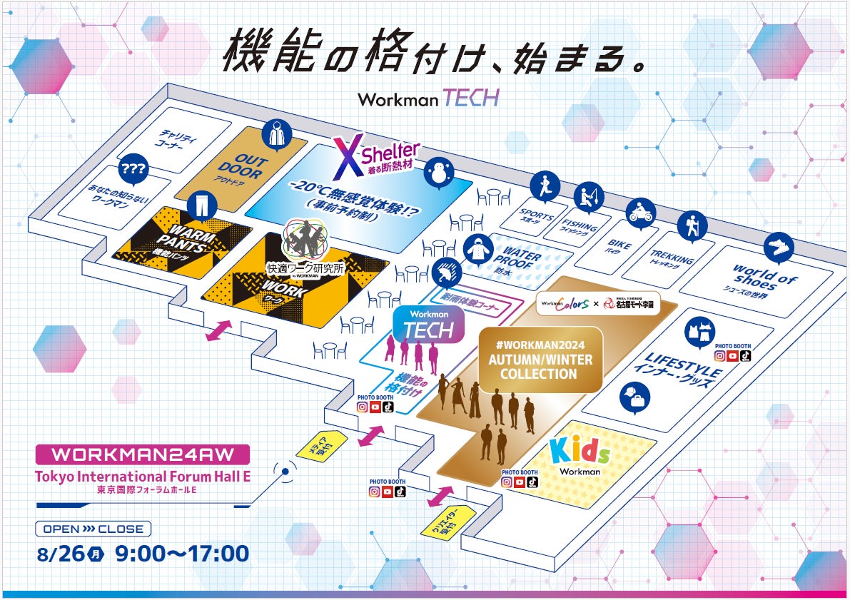 ワークマン368店、WORKMAN Pro10店、WORKMAN Plus568店、さらに話題の#ワークマン女子66店※1や最強の新業態「WORKMAN PlusⅡ」9店の計1021店を展開する株式会社ワークマン(本社:群馬県伊勢崎市、代表取締役社長:小濱英之)は、8月26日(月)に有楽町の国際フォーラム・ホールE1、E2で当社アンバサダー/外部インフルエンサーとマスコミ向けの「ワークマン2024年秋冬新製品発表会」を開催します。今回のメインテーマは「機能の格付け、始まる。」で、ワークマンのお家芸でもある「機能性」を購買顧客にわかりやすく伝えるために製品を「グレード(格付け)」して展示します。会場の広さは5000㎡と超大型会場でアパレル小売業の単独展示会としては国内最大規模になります。参加者はマスコミ120名、当社アンバサダーと一般インフルエンサー500名(総フォロワー数は3600万人)を見込んでおり、SNSを活用したアパレルイベントとしても最大級です。※1ショッピングセンターのWORKMAN Plus12店舗を含みます