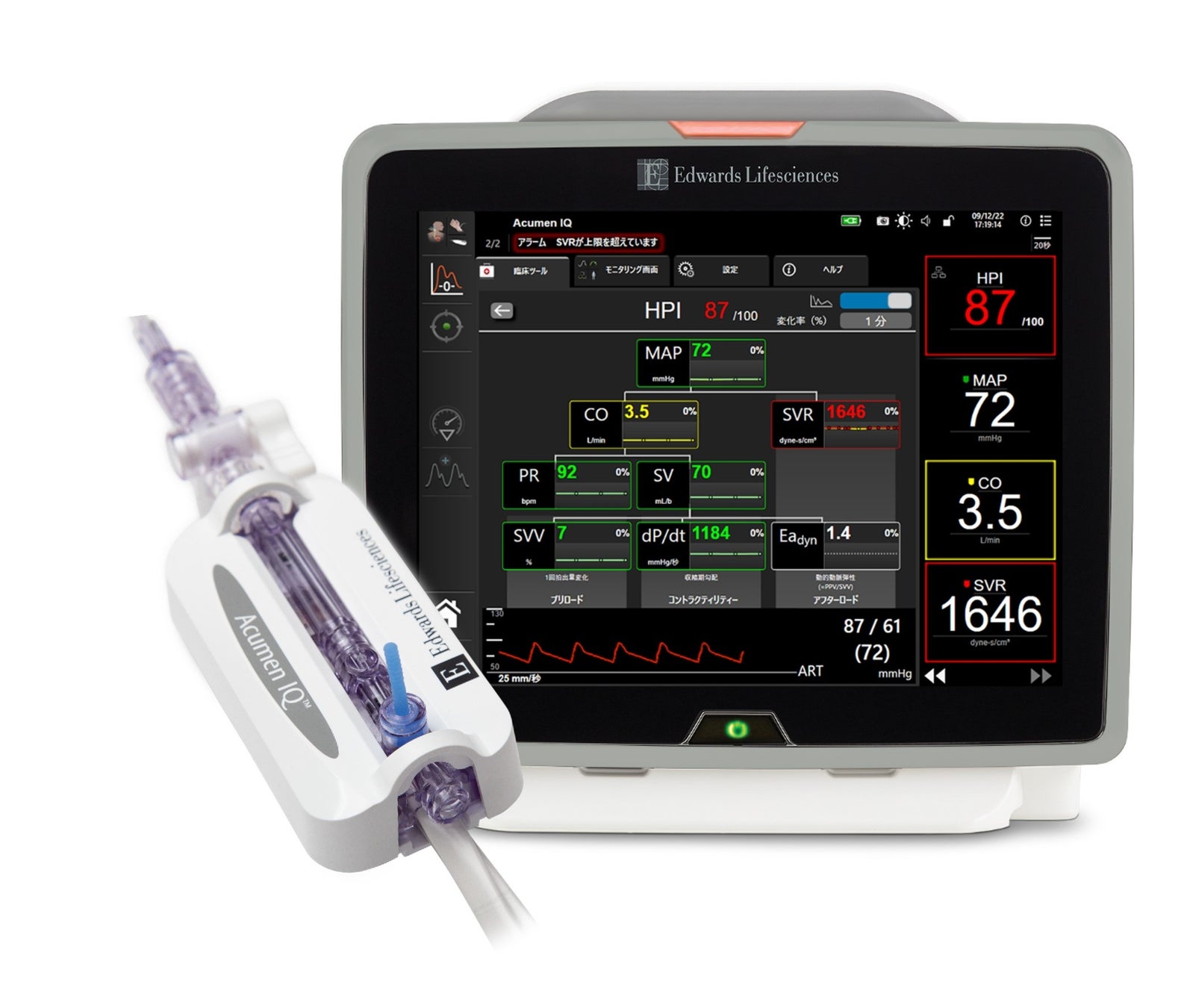 Acumen HPIを利用するには、エドワーズ製モニタと患者さんの末梢動脈圧波形情報を得るための専用センサであるAcumen IQセンサが必要です。