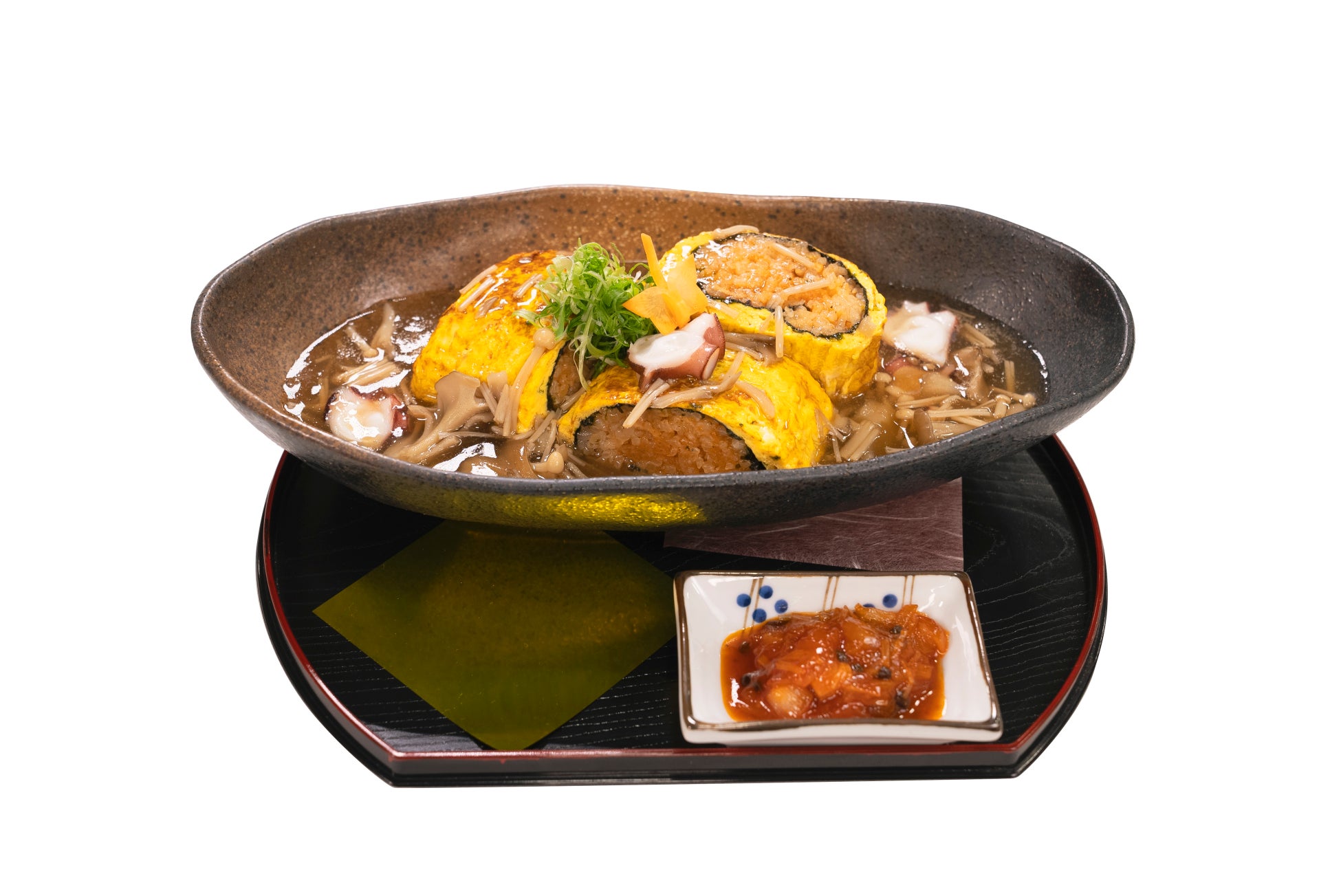 洋食の定番であるオムライスを、板前らしく、炊き込みご飯や出汁巻き卵、カツオ出汁ベースの餡を使用して調理。和の基本であるカツオ出汁を効かせた旨味を楽しめる味付けに加え、山椒とトマトケチャップを合わせた山椒ケチャップを添えることで、パンチのある味変ができ、2度楽しめる仕上がりに。