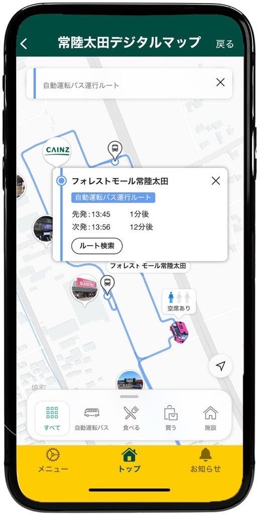 さらに、住民向けに2台の自動運転EVバスのリアルタイムな位置情報や車内混雑情報、バス停・周辺店舗情報等を一元的に可視化したデジタルマップである「常陸太田デジタルマップ」を常陸太田市行政情報アプリ「じょうづるさんナビ*4」を通して提供します。