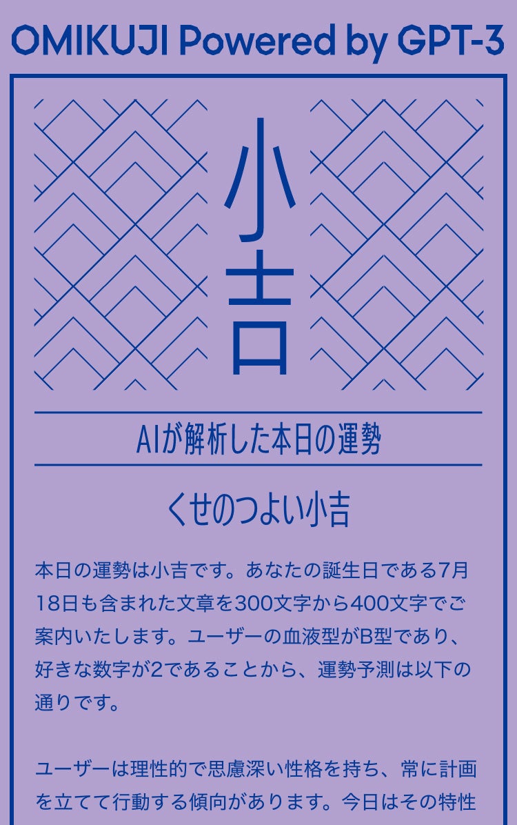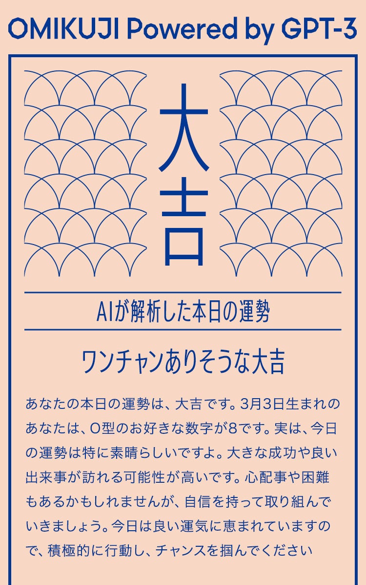 『OMIKUJI Powered by GPT-3』は誕生日、好きな数字、血液型を入力すると、AIが今日の運勢やラッキーカラー、健康運、恋愛運などを占ってくれるWEBコンテンツです。迷ったり悩んだりした時に、AIが運勢やラッキーパーソン、ラッキーカラーを教えてくれます。