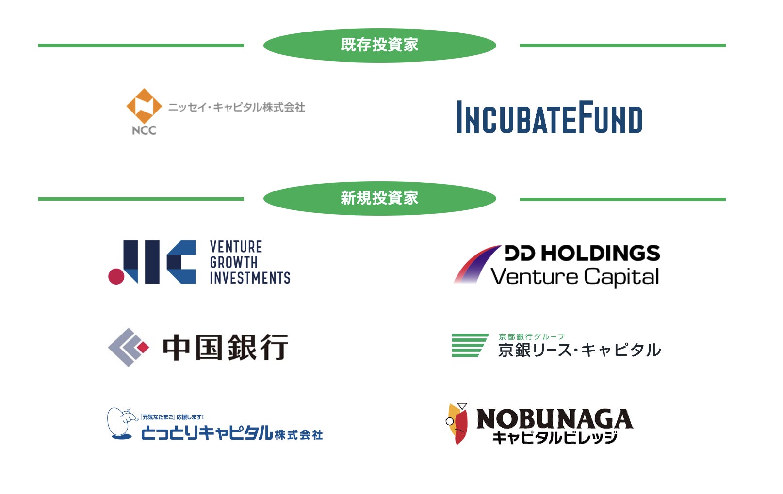 本ラウンドでは、ニッセイキャピタルとインキュベイトファンドの既存インベスター2社に加えて、JIC、中国、京都、十六、鳥取の地銀4行の関連投資会社を新たに株主として迎えることができました。