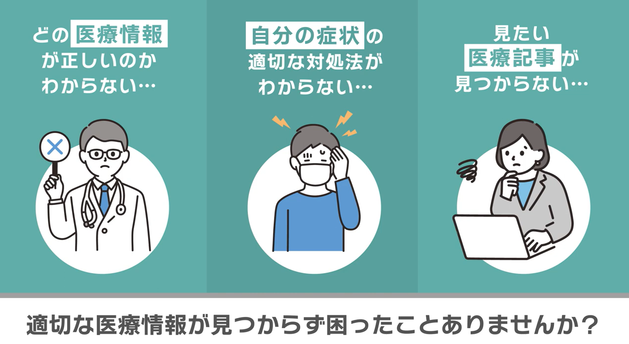 体の悩みは人によってそれぞれ違い、多くの医療情報の中からその人に合った病院やクリニック、ドクター、医療情報を見つけることは容易ではありません。「どの医療情報が正しいのかわからない」「自分の症状の適切な対処法がわからない」「見たい医療記事が見つからない」といったユーザーに対して、専門の医師・歯科医師たちが各々の立場から名前付きで、医療情報を提供します。回答は医師の監修を受けた情報なので安心です。