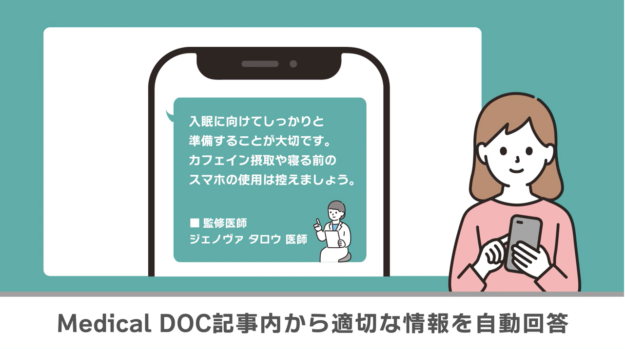 ユーザーは、今まで多くの医療記事の中から時間をかけて自身に適した医療情報を探す必要がありました。「Medical DOC AI chatbot(メディカルドック・エーアイ・チャットボット)」では、対話を通して、自分が求める健康や医療に関わる情報を集めることができ、自分に適した医療情報のレコメンドやコメントを受け取ることができます。