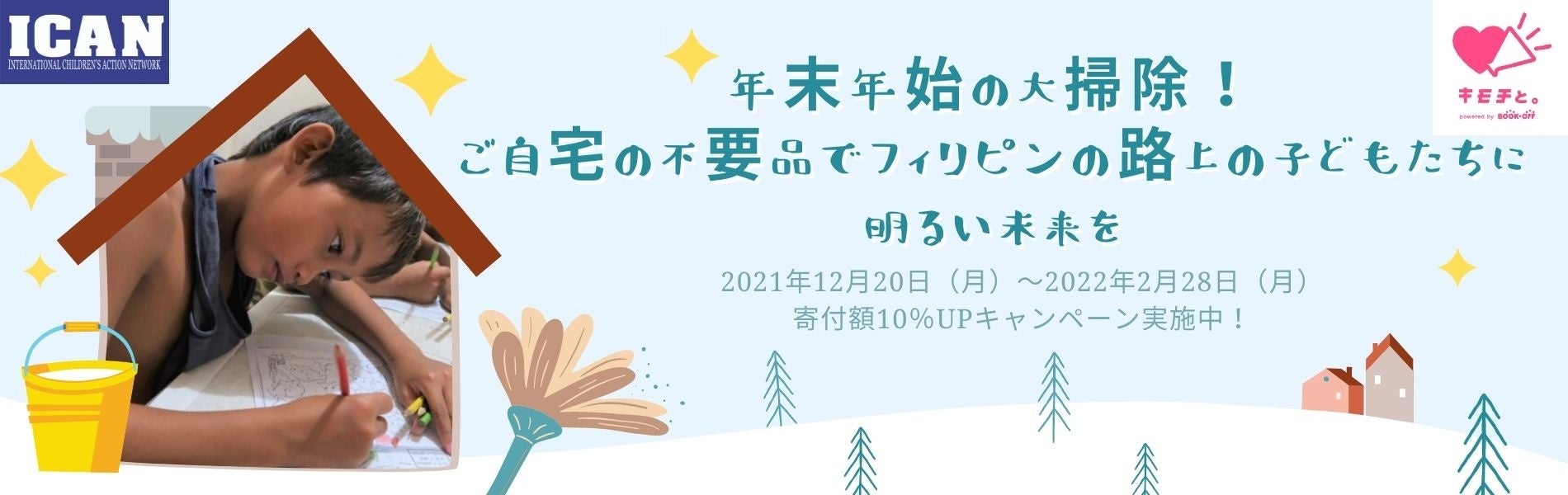 特定非営利活動法人アイキャン(愛知県名古屋市中区、以下、アイキャン)とブックオフコーポレーション株式会社(神奈川県相模原市、以下、ブックオフ)は、2021年12月20日(月)から2022年2月28日(月)までの約2カ月間、フィリピンの路上で生活する子どもたちを応援するキャンペーンを実施します。「キモチと。」はブックオフによる、不要になったモノで、支援、 応援するキモチに変えるサービスです。読み終わった本や、CD・DVD・ゲーム・おもちゃ・ブランド品などの査定額の全額が、フィリピンの路上の子どもたちとの活動に役立てられます。キャンペーン期間中は、ブックオフが査定額に10%を上乗せして寄付を行います。ぜひ皆様のご協力をお願いします。