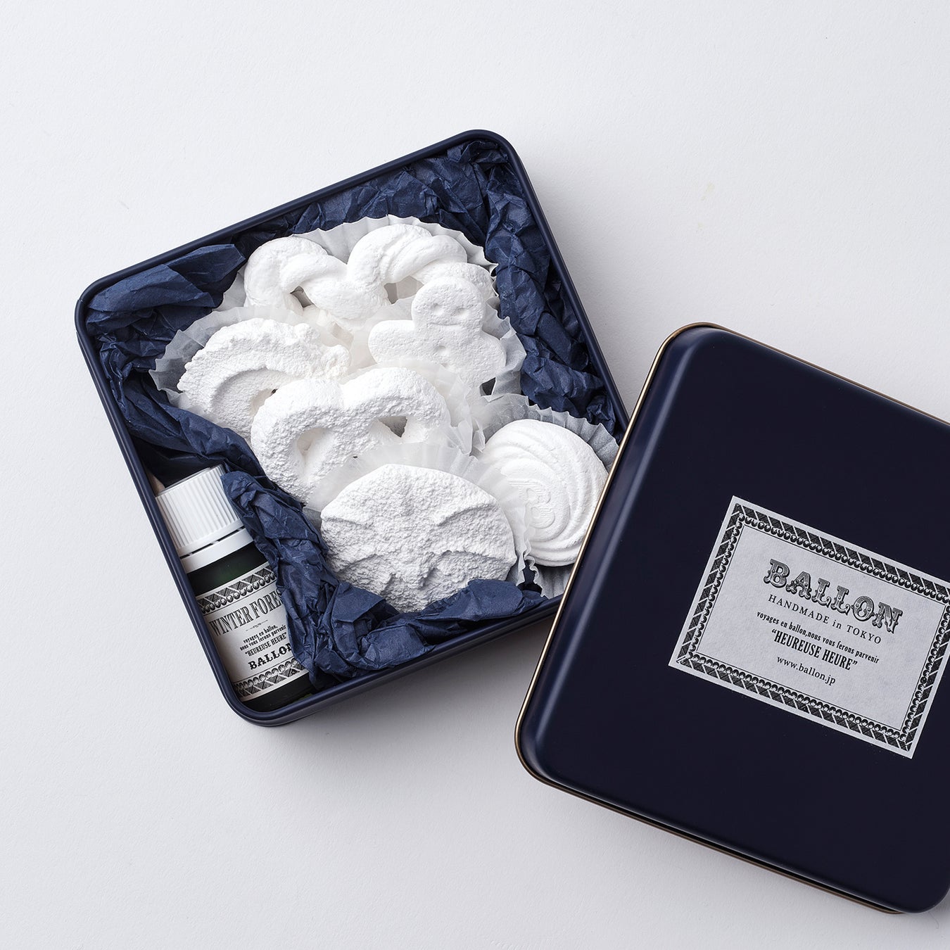 クッキーやプレッツェルのデザインのアロマオーナメントが詰まった、BALLONらしいクッキー缶です。クリスマスシーズンに欠かせないヨーロッパの伝統的な焼き菓子、ジンジャーマンクッキーはその昔、病気予防や魔除けのためのお菓子として取り入れられた歴史も。一年を締めくくるHolidayシーズンにふさわしく、新たな年明けの願いをこめたギフトにも最適す。