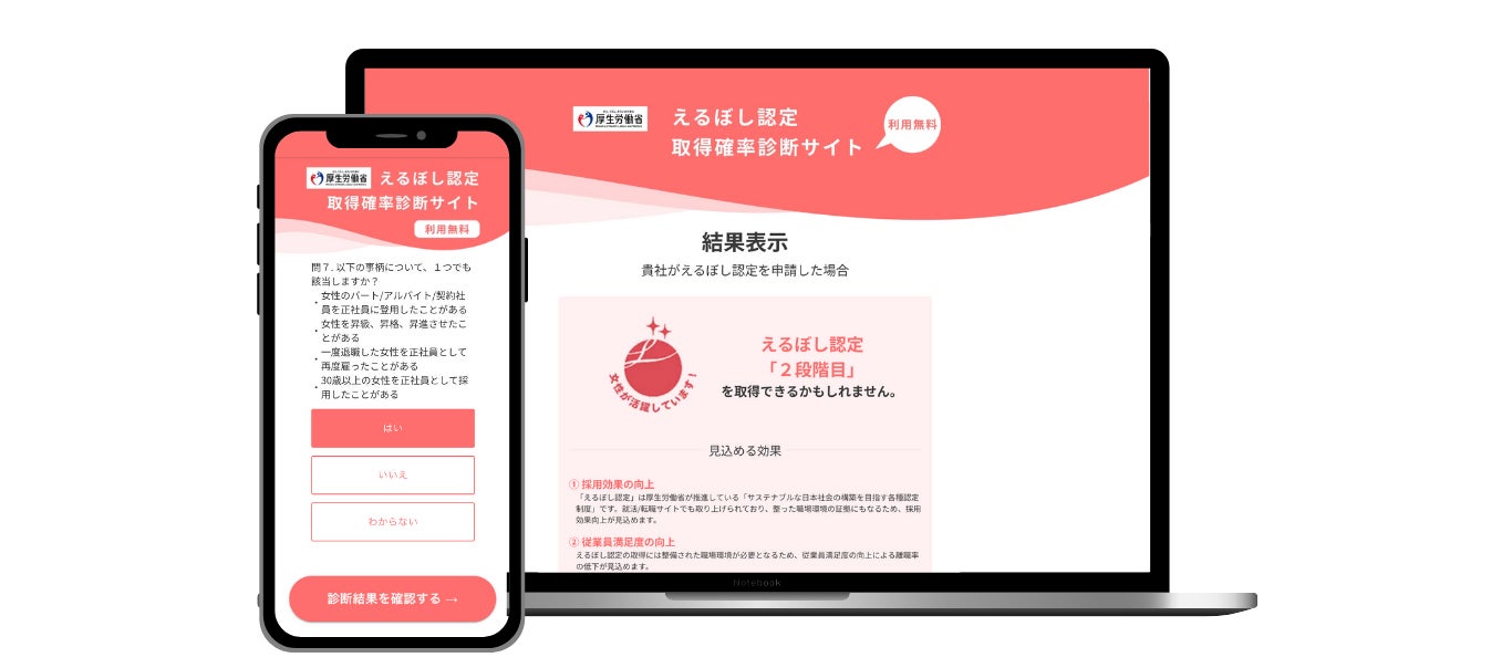 公開されたWeb診断サイトでは、簡単な設問に答えるだけで、「えるぼし認定」の取得可能性と該当段階(★1~3)をその場でチェックできます。