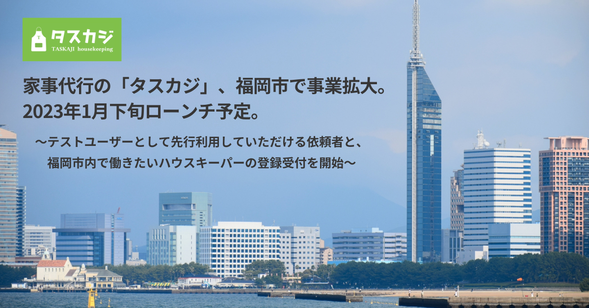 シェアリングエコノミーの家事代行マッチングプラットフォーム「タスカジ」を運営する、株式会社タスカジ(本社:東京都港区、代表取締役:和田幸子、以下タスカジ)は、福岡県福岡市での事業展開を開始します。福岡市での正式なサービスローンチは2023年1月下旬を予定しております。サービスの正式開始に先駆けて、本日12月5日より先行利用していただけるテストユーザー(依頼者)と、福岡市内で働きたいハウスキーパー(タスカジさん)の登録受付を開始いたします。