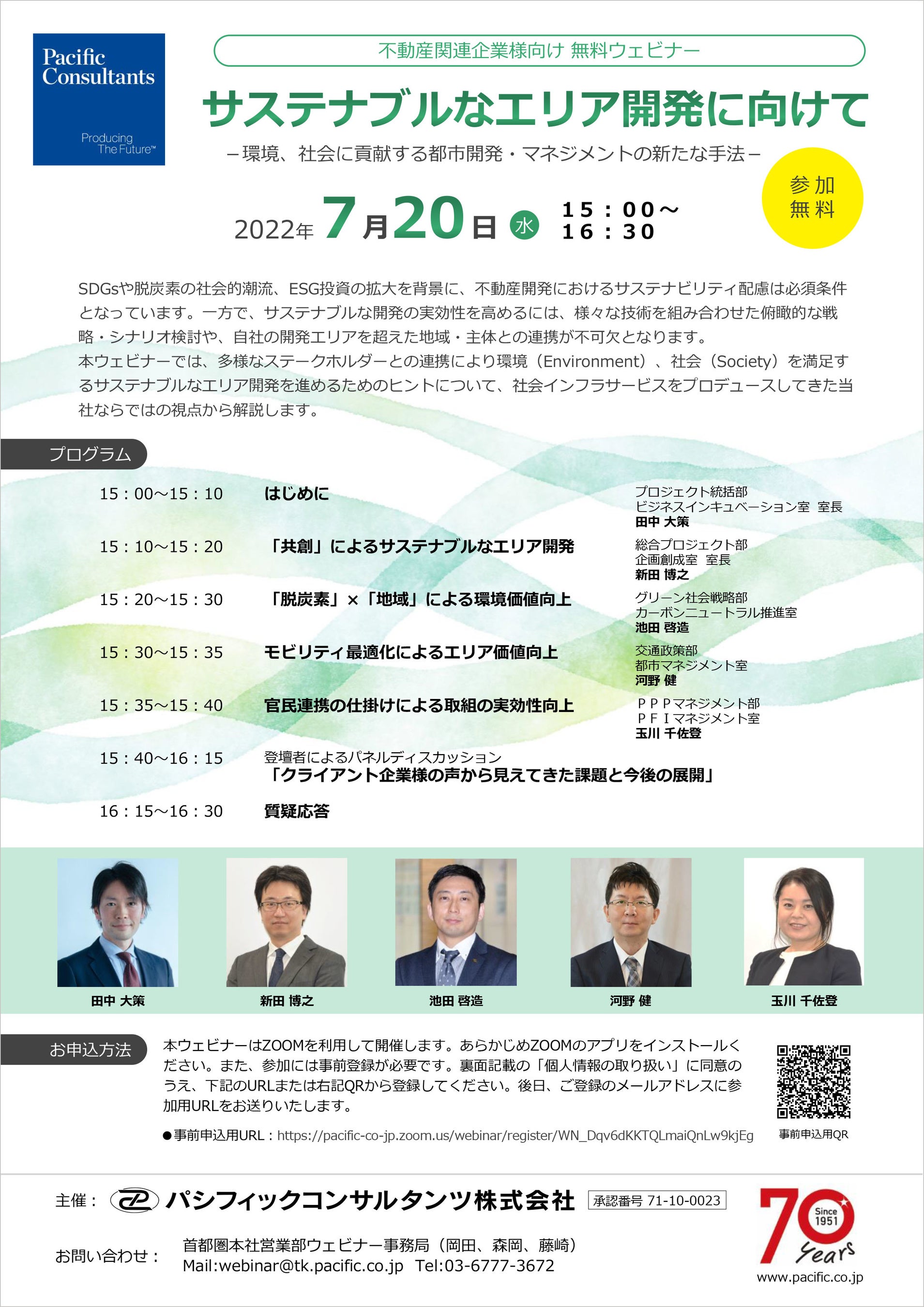 パシフィックコンサルタンツ株式会社(住所:東京都千代田区、代表取締役社長:重永智之)は、不動産関連企業様を対象にしたウェビナー『サステナブルなエリア開発に向けて~環境、社会に貢献する都市開発・マネジメントの新たな手法~』を開催いたします。