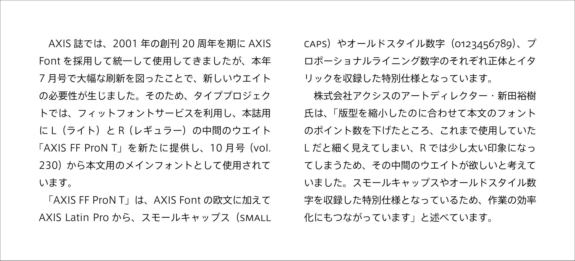 AXIS誌では、2001年の創刊20周年を期にAXIS Fontを採用して統一して使用してきましたが、本年7月号で大幅な刷新を図ったことで、新しいウエイトの必要性が生じました。そのため、タイププロジェクトでは、フィットフォントサービスを利用し、本誌用にL(ライト)とR (レギュラー)の中間のウエイト「AXIS FF ProN T」を新たに提供し、10月号 (vol.230) から本文のメインフォントとして使用されています。