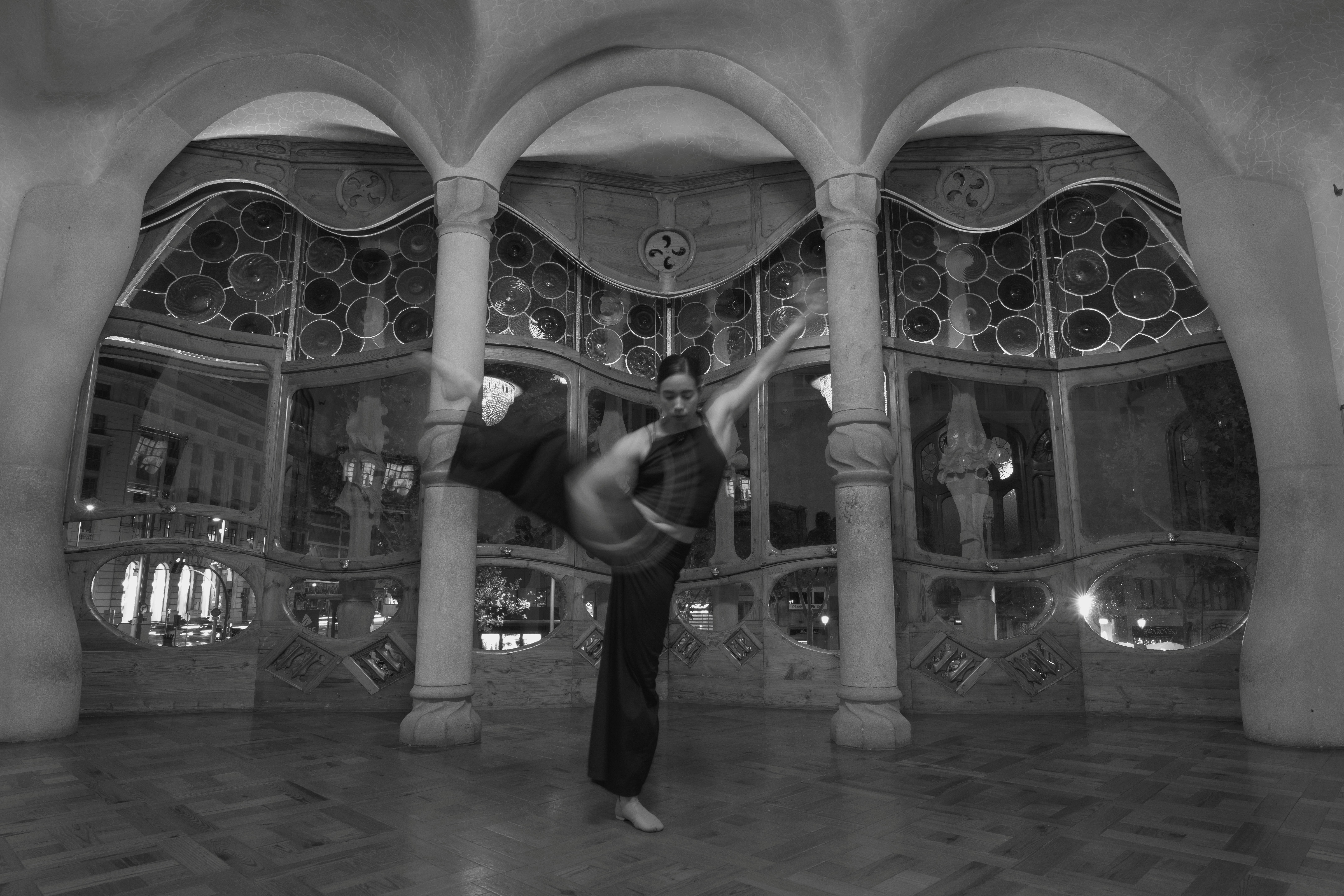 本作では、国際的に活躍するダンスアーティスト/振付家 高瀬文子 が参加。彼女の身体表現はモーションキャプチャ技術によって記録され、建築と一体化した映像表現としてファサードに投影されます。ダンスは建築を「背景」ではなく「対話の相手」として捉え、ガウディ建築の曲線や質感に直接呼応する形で生み出されました。