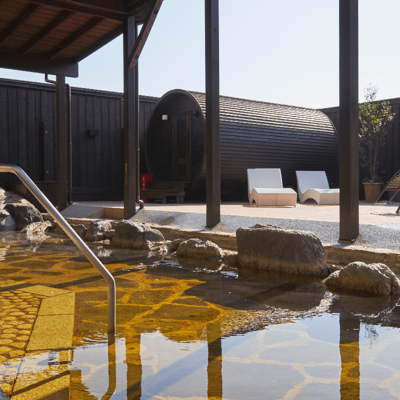 地下1,500メートルから汲みあげる天然温泉の泉質は「含鉄-ナトリウム-塩化物強塩冷鉱泉(高張性・弱アルカリ性・冷鉱泉)」。保温効果が高く、疲労回復への効能はもちろんのこと、弱アルカリ性の泉質でお肌がすべすべになると好評です。男女別の内湯、露天風呂、ドライサウナが完備。さらに新設アイテムとして、セルフロウリュができる「バレルサウナ」が追加されました。