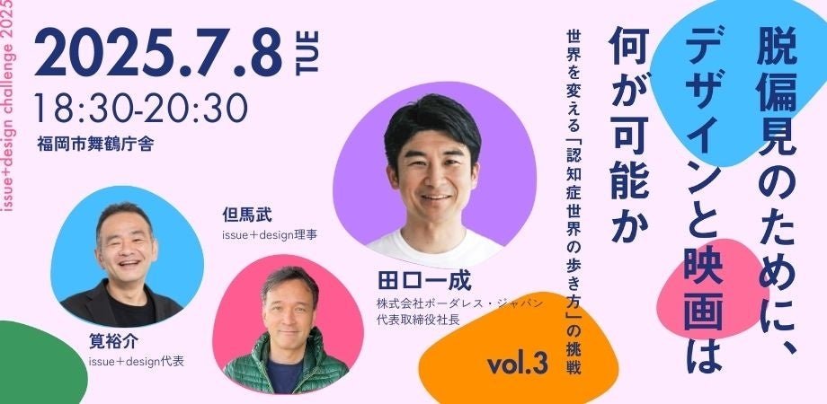 デザインを通じて社会課題の解決に取り組む特定非営利活動法人 issue+design(イシュープラスデザイン/代表:筧裕介、東京都文京区)は、『認知症世界の歩き方』映画制作決定を記念して、「脱偏見」をテーマにしたシリーズイベント『issue+design challenge 2025「脱偏見のために、デザインと映画は何が可能か」』を、2025年5月13日より開始いたします。2026年秋の映画公開に向けて、全国各地をキャラバン形式で巡り、毎回多彩なゲストを迎えて開催していきます。
