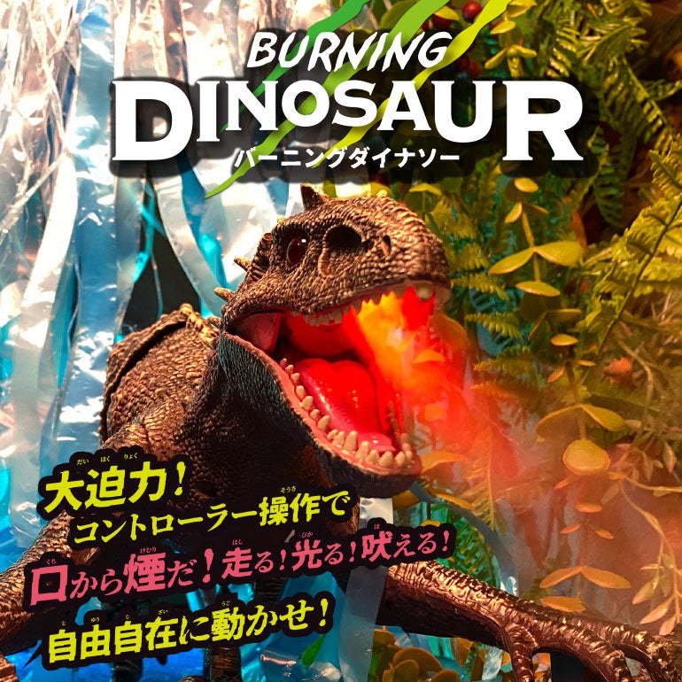 リアルな恐竜フィギュアが胴体と尻尾を左右にくねらせて動きまわる、その姿はまるで獲物を狩るハンター。古代生物“ダイナソー ラン”シリーズ第2弾「バーニング ダイナソー」登場。大きく開いた口内が怪しく真っ赤に光り、不気味な雰囲気を漂わせます。また、響き渡るような“うなり声”を発して周囲を威嚇。そして注目は、口から煙を吐く能力を身につけたことで、伝説の生物へと超進化を遂げました。操作方法は簡単かつ前後左右のフルファンクションで遊べるので、初めての恐竜R/C(ラジオコントロール)でも、安心して飼い慣らせることでしょう。