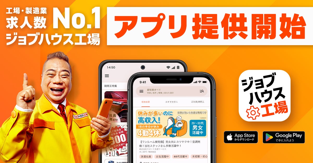国内最大級の工場・製造業専門の求人サービス『ジョブハウス工場』、アプリの提供を開始