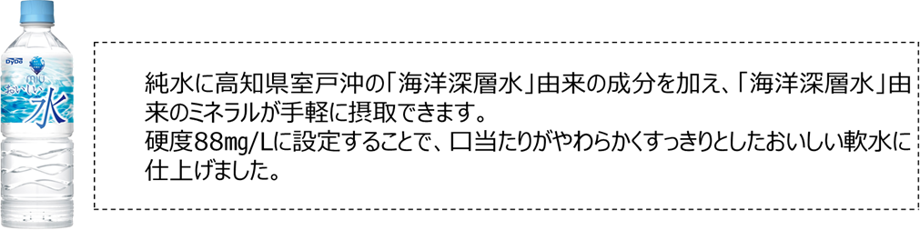 「ミウ おいしい水」は、純水に、海洋ミネラルを後から加える事で硬度を調整(硬度88mg/L)。飲みやすく、おいしい軟水に仕上げました。