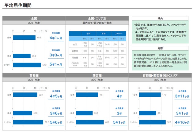 また、今回の調査の内容を見ると居住期間が過去と比較し、長期化する傾向が見られた。これは、コロナ禍の経済的な影響により引っ越し費用等の転居に伴う一時金支払いを避けたことや、企業が「望まない転勤」を廃止する転勤抑制策を行った結果などが、本背景として見られる。実際に、2020年下期に実施した同平均居住期間調査(選択式)と比較したところ、ファミリー世帯では、4~6年間居住する割合が2019年の調査比では、3.1%居住期間が増加するという結果が出ている。コロナ感染症の拡大ピーク時と比べて、少しずつ日常を取り戻しているが、経済的、社会的な背景を起因とした、居住期間の傾向が見られた。
