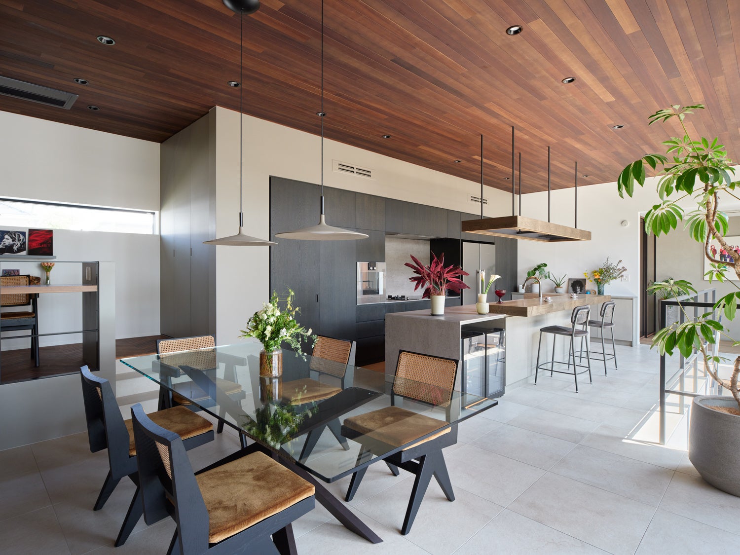 非日常感のあるリゾート風テラスに調和する内装は、ひとつひとつ妥協のない素材の選定、個性と技術を感じさせる仕上げにより、落ち着いたシックな雰囲気ながらありきたりにならず、上質で特別感のあるデザインに仕上がっています。