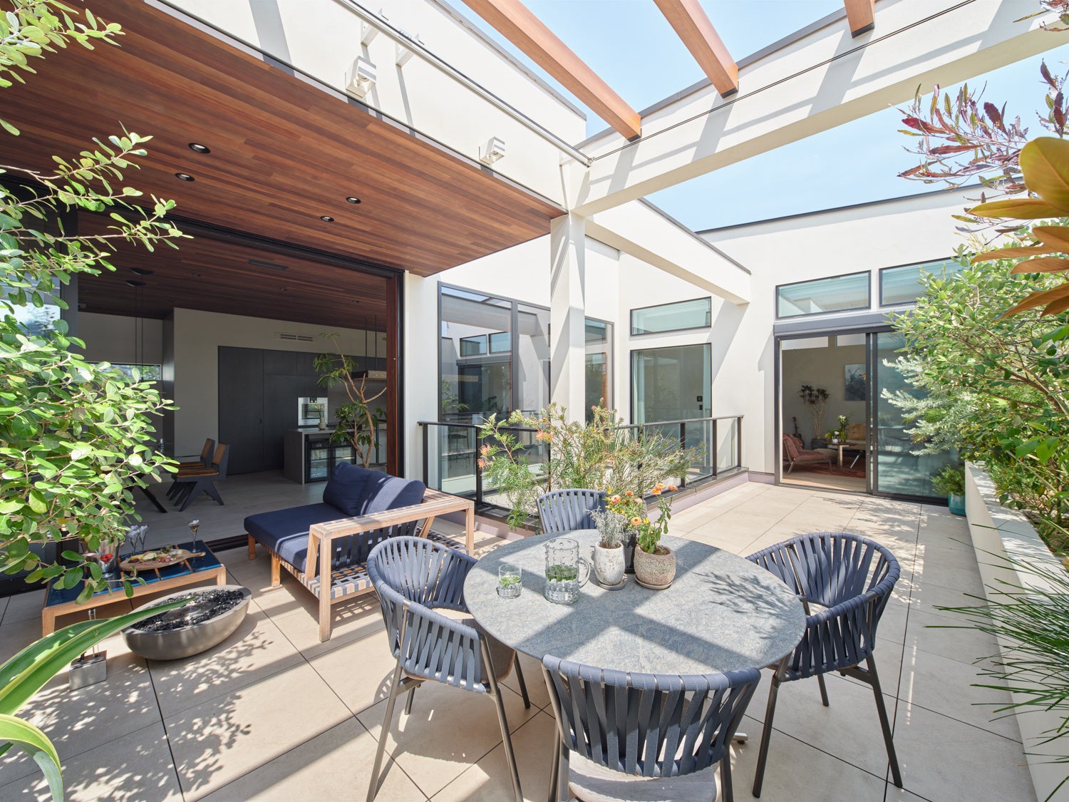 アウトドアリビング・ダイニングとなる大きなテラスや緑豊かな中庭と室内空間を繋ぎ、広がりと非日常感を愉しめるように計画しました。