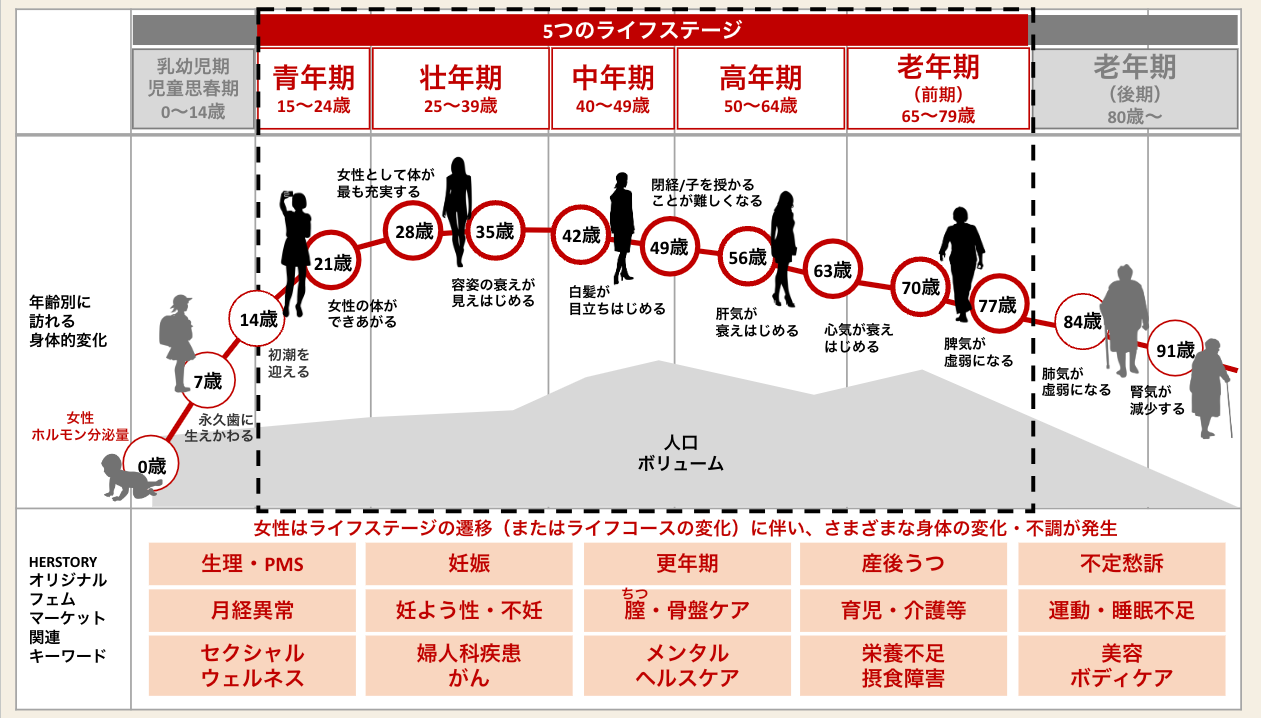 市場縮小が企業の課題となる中、「日本市場は消費の8割が女性」と言われることから、女性マーケットの開拓や女性向け商品開発を強化する企業が増えています。しかし、女性市場は複雑化しており一括りにはできません。同世代でも家族構成、就業状況などによって消費行動が大きく変わることから、ライフコースで変化する関心や好みに細やかに対応するサービスが求められています。女性トレンド総研HERSTORYは、家族・就業構成に応じて購買行動が大きく異なる6つのライフコースを定義しています。