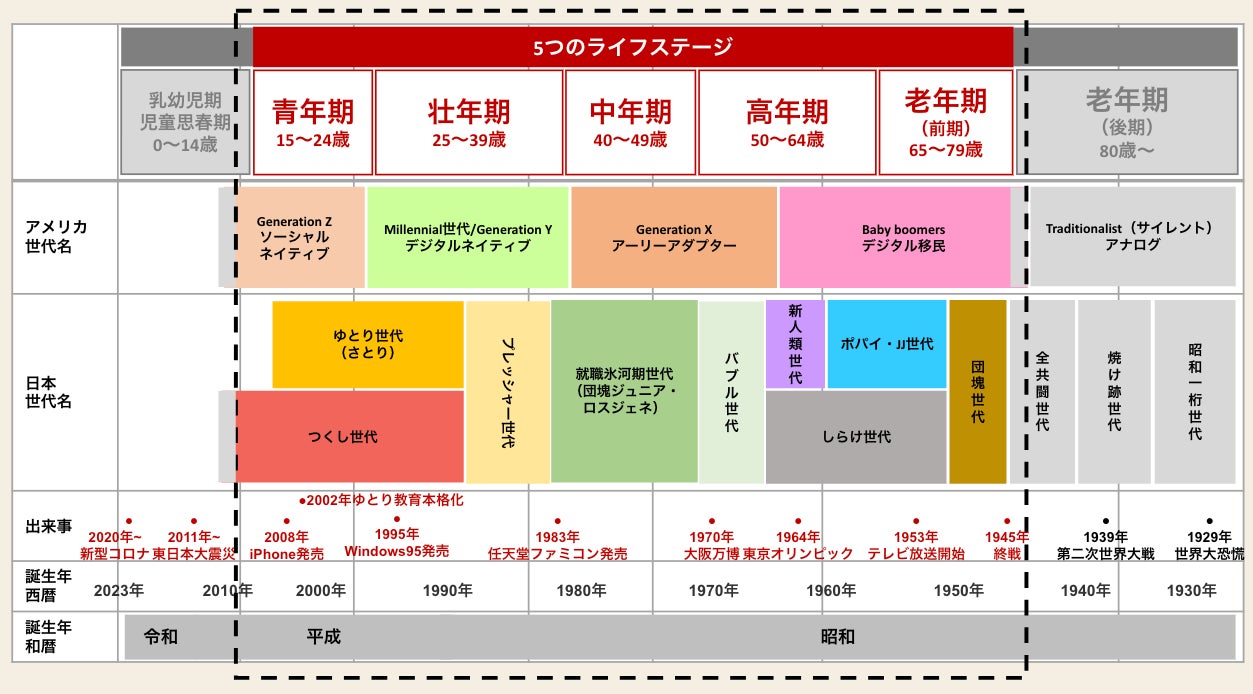 年齢に応じて変化する人生の立ち位置を「ライフステージ」と呼びます。これは、生活環境や経験によって影響を受け、世代ごとに異なる価値観や考え方が生まれる現象です。本誌では、特に消費力の高い「青年期~老年期(前期)」の働く女性を対象に、ライフステージを定義しました。
