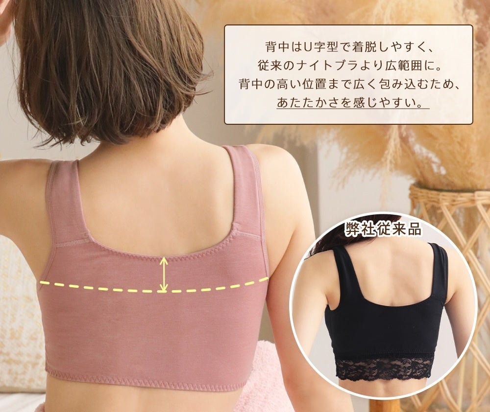 これからの寒い季節、特に女性の体に冷えは大敵。あたたか素材を使用したナイトブラは冷え対策をしながらバストケアも期待できる優れもの。背中の高い位置まで優しく包み込むので、冬の就寝時の背筋からの寝冷えも予防し、冷え対策にもおすすめです。肌当たりがやわらかい素材を使用しているため、締め付け感がなく優しい着け心地です。おうち時間をより快適に過ごしながら温活を始めてみませんか?
