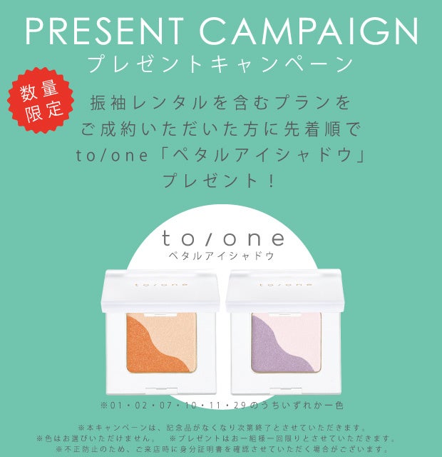 「クラネ」にご来店いただき、振袖レンタルを含む各プランをお申込みいただいた方に、先着順で、特別特典としてナチュラル&オーガニック メイクアップブランド「to/one(トーン)」の「ペタルアイシャドウ」を1色プレゼントいたします。数量限定となっておりますので、お早目のご来店がおすすめです。