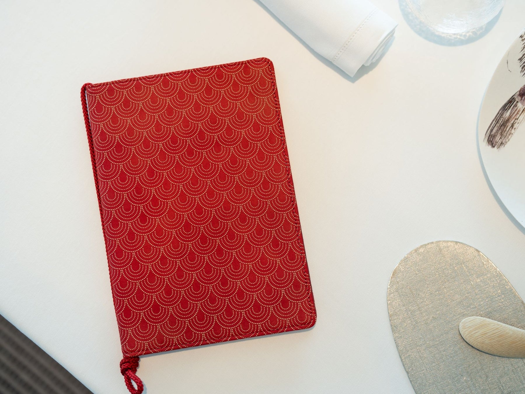 今回のワールドツアーを象徴するアイテムとして、山梨県の伝統工芸「甲州印伝(こうしゅういんでん)」が採用されました。1582年創業の印傳屋が手掛ける特別仕様のメニューカバーは、「アラン・デュカス スパークリングサケ」のラベルデザインに着想を得た波紋文様を、漆で鹿革に描いたもの。地中海を想起させるアラン・デュカスの料理世界と、七賢が誇る白州の名水を重ね合わせ、二つの文化が共鳴し合う“波”として表現しています。