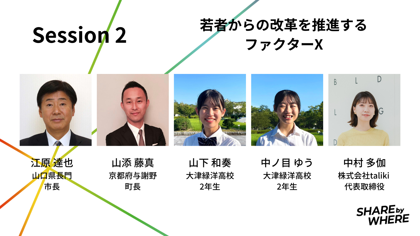 ◉登壇者:江原 達也さん(山口県長門市長)、山添 藤真さん(京都府与謝野町長)、山下 和奏さん(大津緑洋高校2年生)、中ノ目 ゆうさん(大津緑洋高校2年生)、中村 多伽氏(株式会社taliki 代表取締役)