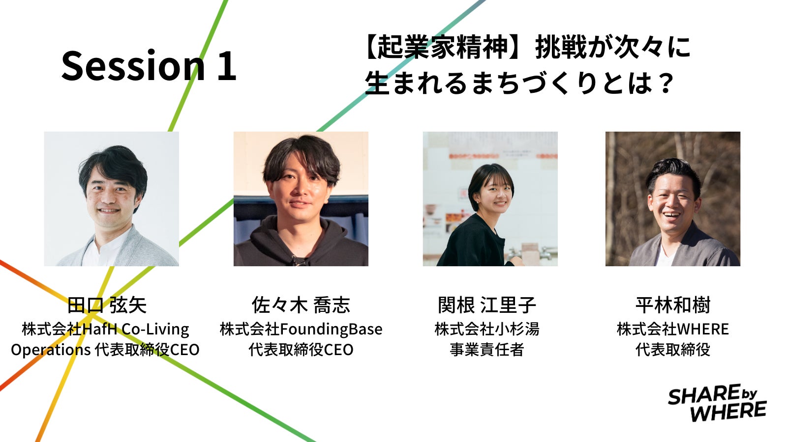 ◉登壇者:田口 弦矢さん(株式会社HafH Co-Living Operations 代表取締役CEO )、佐々木 喬志さん(株式会社FoundingBase 代表取締役CEO)、関根 江里子さん(株式会社小杉湯 事業責任者)、平林 和樹(WHERE INC 代表取締役)