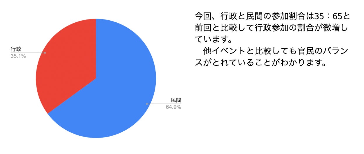 参加者は民間企業が6.5割、行政が3.5割のうち、民間企業は経営者層(取締役以上)の参加者25%、行政は係長以上の役職の参加者が45%と、全体として事業責任者以上の、決裁権を担う方の参加が高い傾向にあります。、イベント開催時のみの盛り上がりで留まることなく、その後の継続的な繋がりやプロジェクト連携が行われていることが他ではない大きな特徴として、参加された方々からも好評の声をいただいております。
