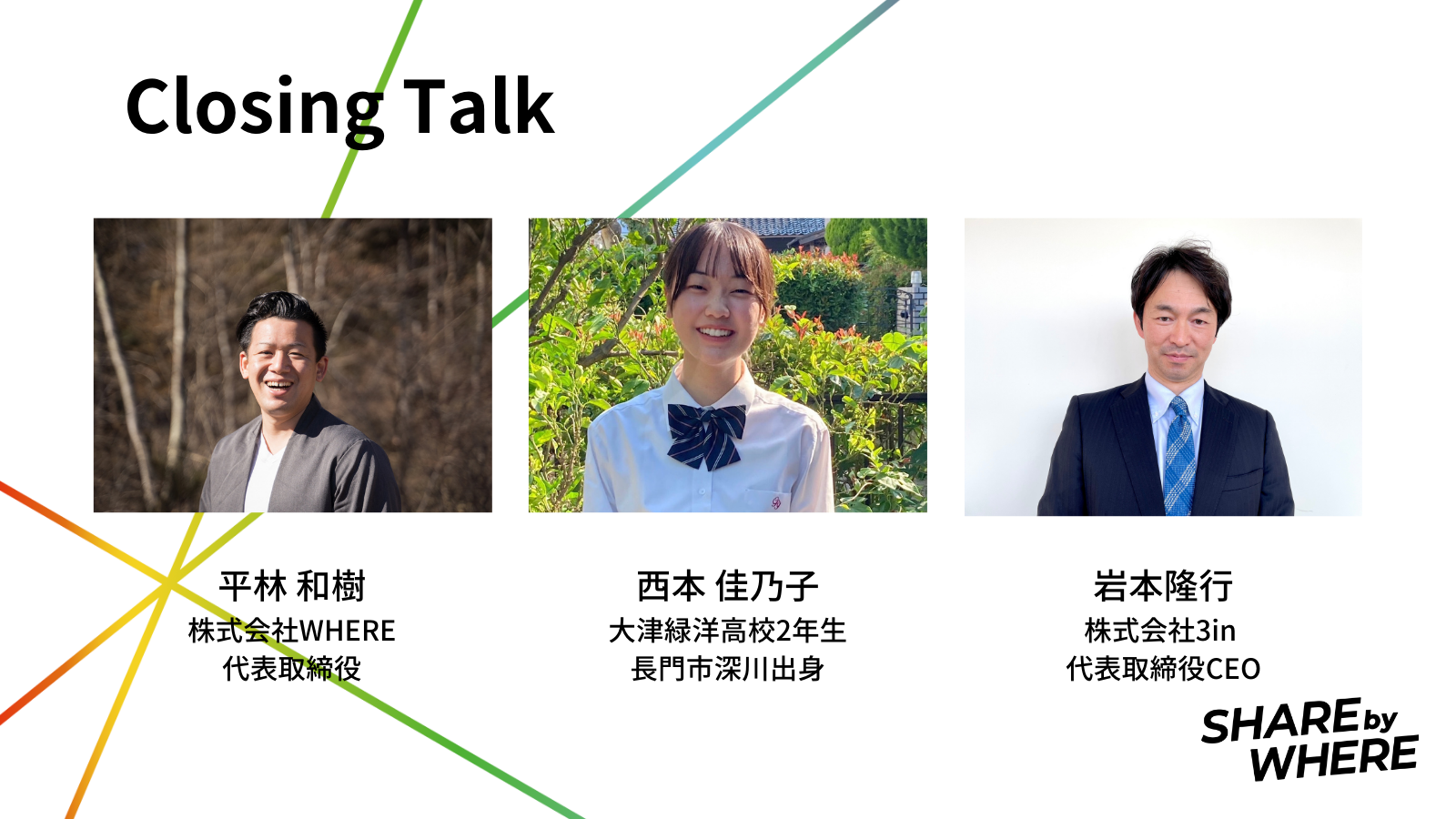 ◉登壇者:平林 和樹(WHERE INC 代表取締役)、西本 佳乃子氏(大津緑洋高校2年生)、岩本 隆行氏(株式会社3in 代表取締役)