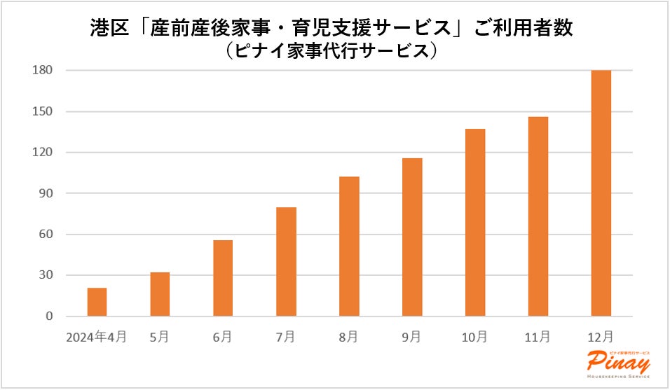 港区「産前産後家事・育児支援サービス」におけるピナイ家事代行サービスの利用は月を追うごとに拡大し、2024年12月には月間利用者数180名、合計1,355時間の家事支援サービスを提供いたしました。特に年末の大掃除需要と相まって、多くのご家庭にご活用いただきました。
