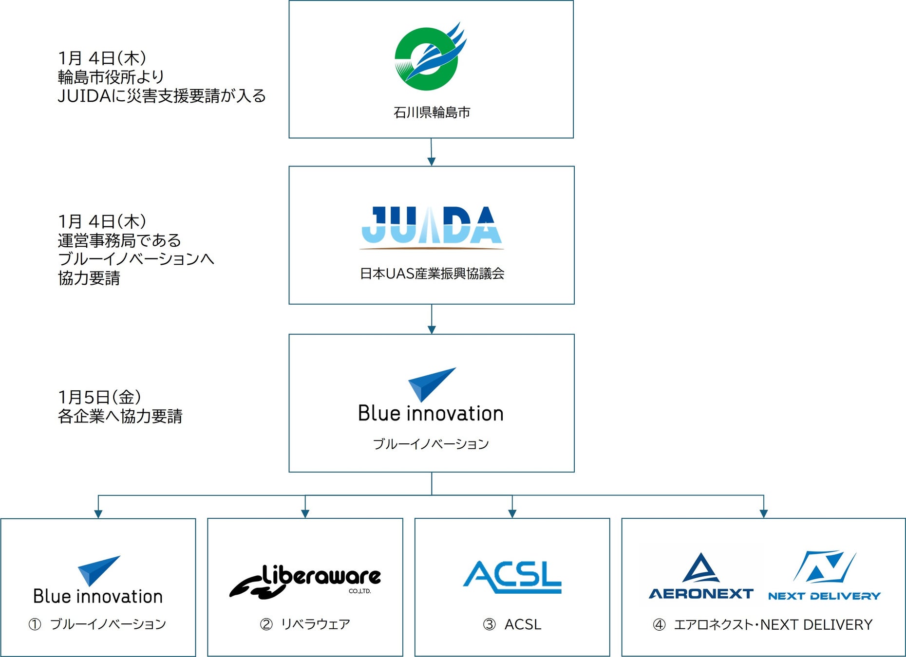 この度の能登半島地震の影響により、被災された方々やご家族の皆様に、心よりお見舞い申し上げると共に、皆様の安全と一日も早い復興を心よりお祈り申し上げます。 本地震に際し、株式会社エアロネクスト(以下エアロネクスト)、株式会社ACSL(以下ACSL)、株式会社NEXT DELIVERY(以下NEXT DELIVERY)、ブルーイノベーション株式会社(以下ブルーイノベーション)、株式会社Liberaware(以下リベラウェア)、のドローン関連5社※1は、ドローン業界団体である一般社団法人日本UAS産業振興協議会(JUIDA)※2の指揮の元、石川県輪島市の要請を受け、同市内においてドローンによる捜索や被災状況確認、物資輸送等の初期災害時支援活動を実施しました。