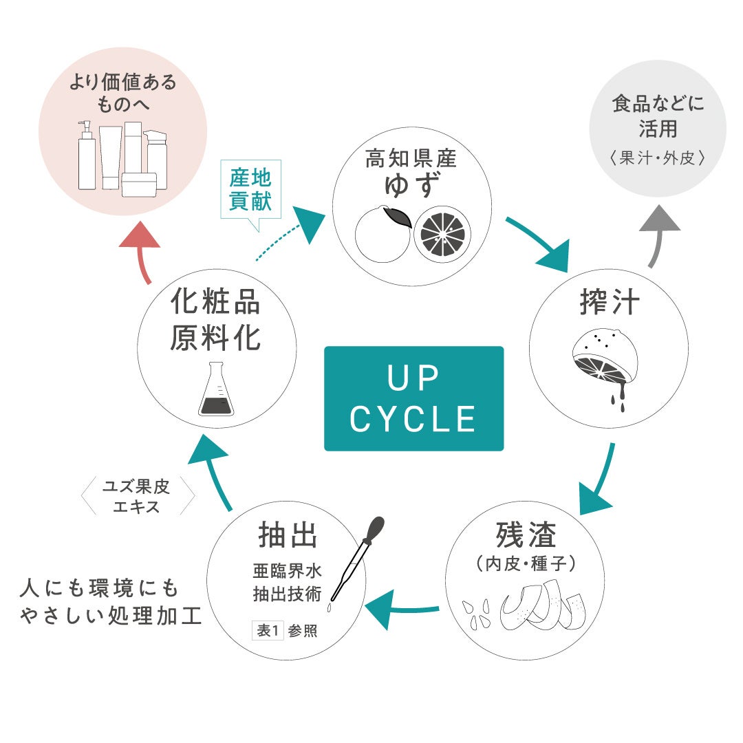 日本最大のゆずの産地である高知県では、収穫したゆずの外皮は利用価値が高く、活用が進んでいますが、内皮や種子は使用するシーンがほとんどなく、搾汁量の約半分が残渣となって廃棄されています。この未利用資源の残渣を有効活用し、化粧品原料化したのが【ユズ果皮エキス*】です。エタノールなどの有機溶媒を使用せず、高圧力下で加熱した沸騰しない水だけを使用する、人にも環境にもやさしい『亜臨界水抽出技術』によって抽出しています。