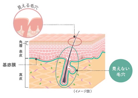 毛穴は、肌表面の「見える毛穴」だけではなく、肌の奥深くまで入り込んだ構造をしています。肌内部には「見えない毛穴」が続いていて、毛穴のまわりを囲むように、基底膜が『毛穴の壁』となって毛穴の構造を支えています。