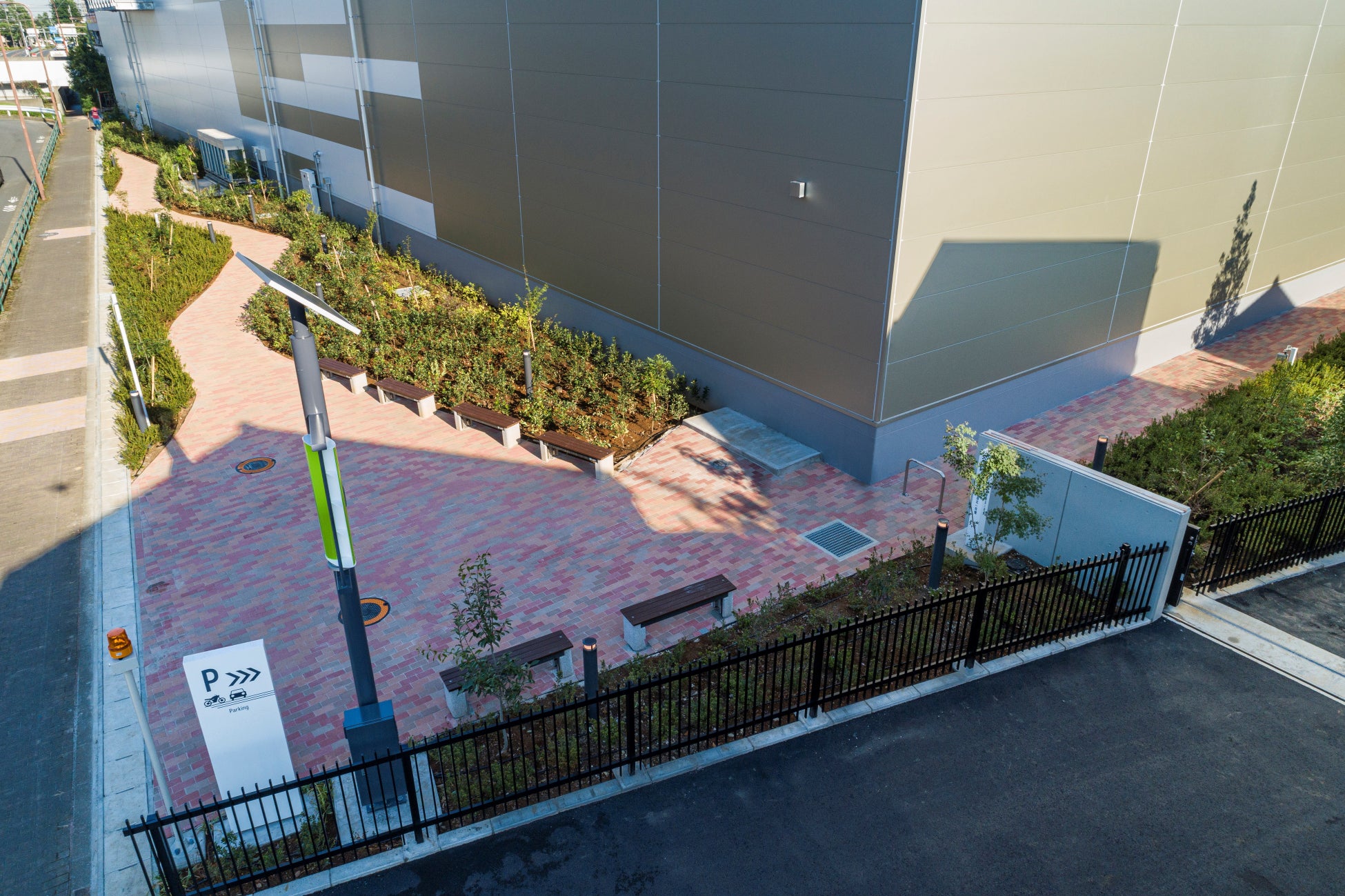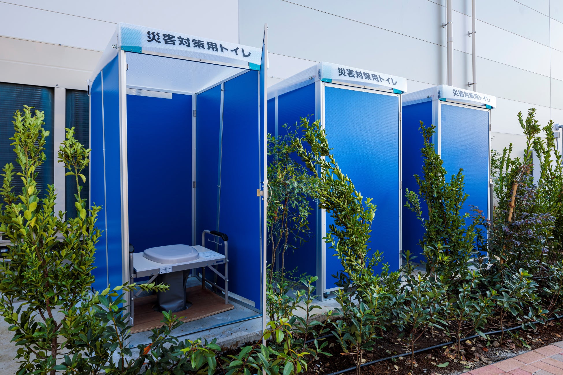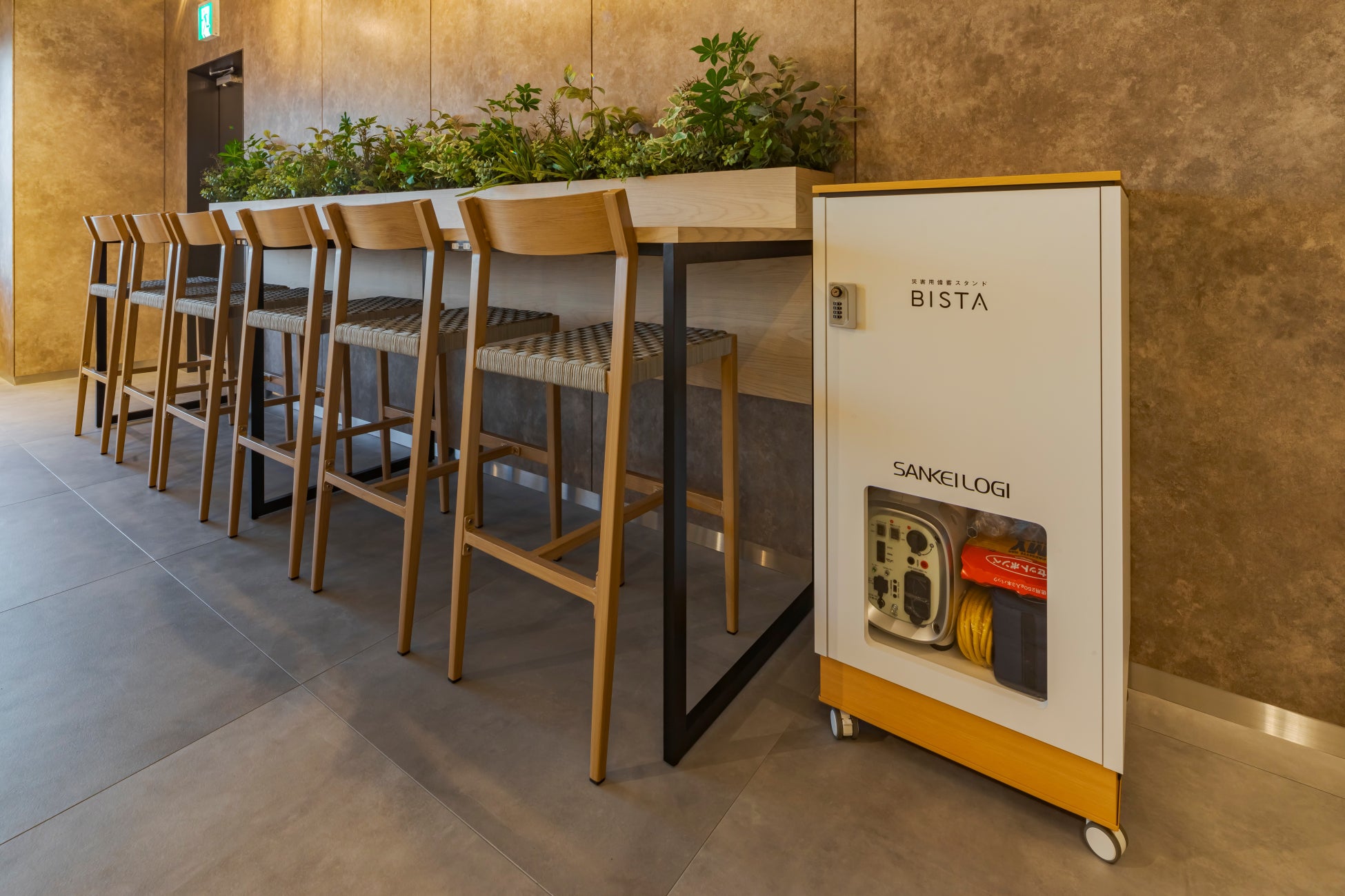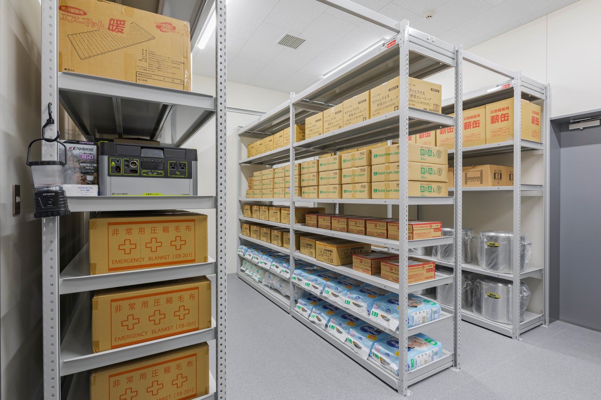 本物件では、地震などの大規模な災害が発生した際に、防災活動の拠点として機能することを目指した自主管理公園を敷地北側に設置しました。公園にはかまどベンチやマンホールトイレ、災害対応ベンダー等を設置するほか、公園側からもアクセス可能な災害用備蓄倉庫を配置。水や食料、毛布・発電機等を備えて、有事の際には従業員に限らず近隣の方々にもご利用いただけます。また、建物内の共用部には災害用備蓄スタンド(BISTA)を設置しております。