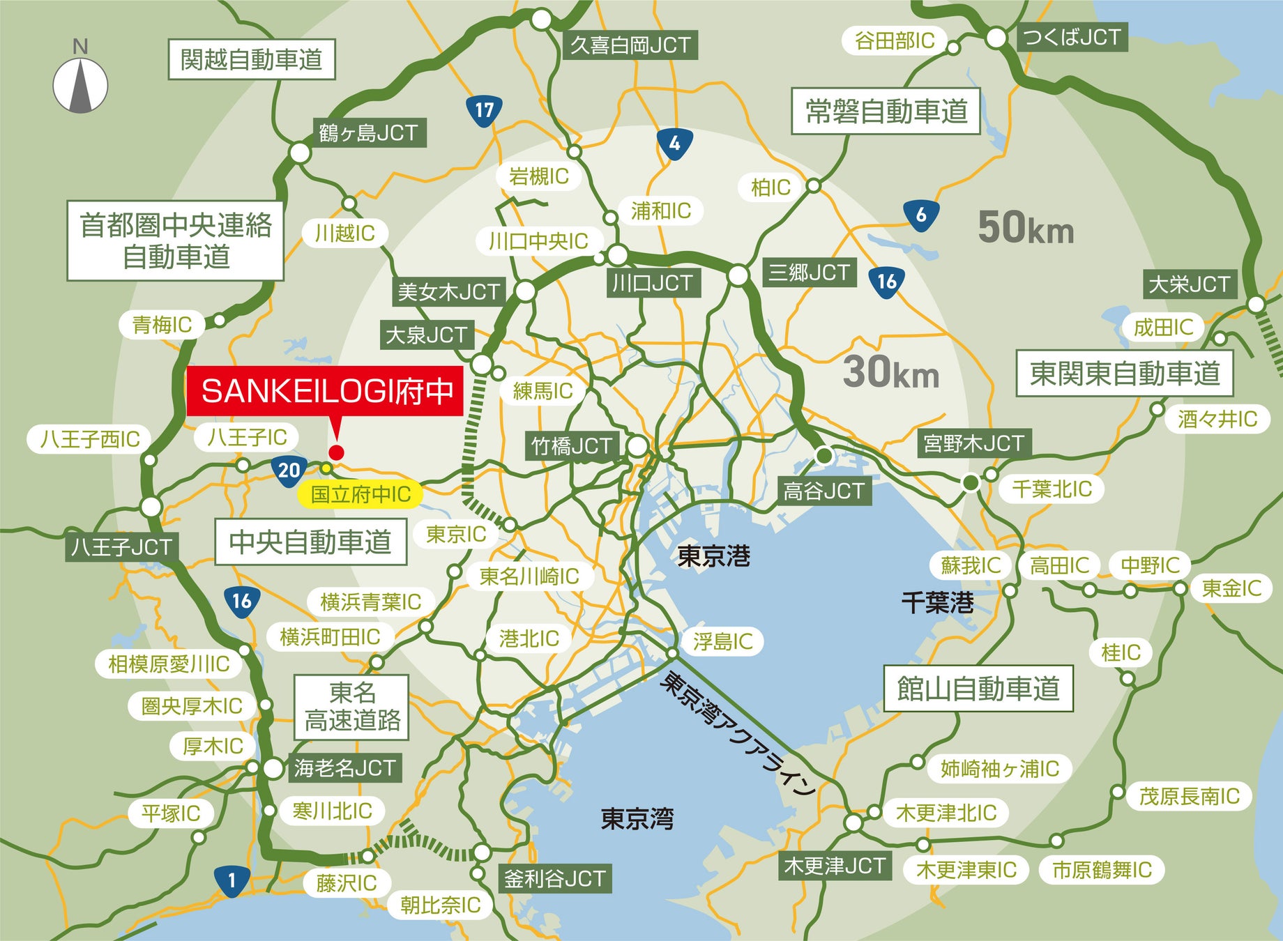 本物件は、東京都心まで30㎞圏内と近接していることから都心配送の拠点のみならず、最寄りの国立府中ICを利用して広域配送の拠点としてもご利用いただけます。またJR武蔵野線「北府中駅」から徒歩約10分と、物流施設の立地としては通勤アクセスが良く、従業員確保の面でも魅力的なエリアです。