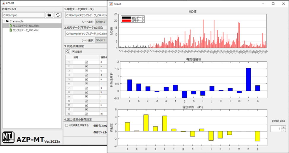 AZP-MTは多変量解析の一種で、分類問題に有効な解析手法です。正常品のデータで単位空間を作成することによって、異常品の判別や、項目間の交互作用の解析を行う事が出来ます。