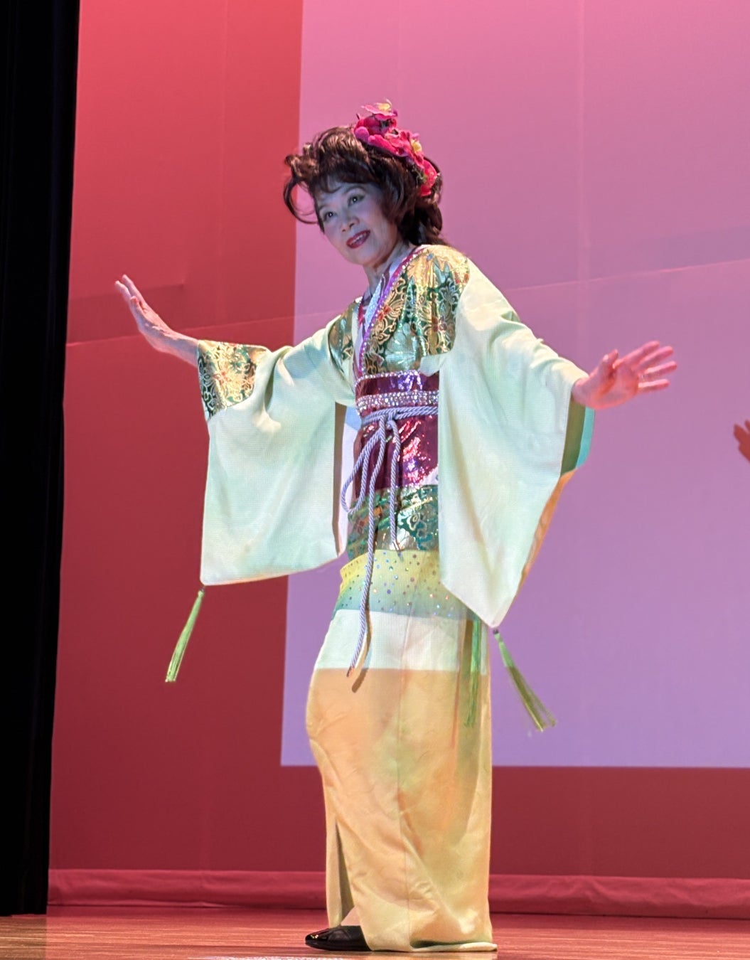 前半は、母の振袖のリメイクや帯を活用したジャケットなど、個々の歴史を背負った装い。後半は、デザイナー・飛鳥井蓮子氏による独創的で奇抜なアレンジ着物が登場しました。シニアの概念を覆す前衛的なデザインと、モデルたちの堂々とした着こなしに、会場中が魅了されました。